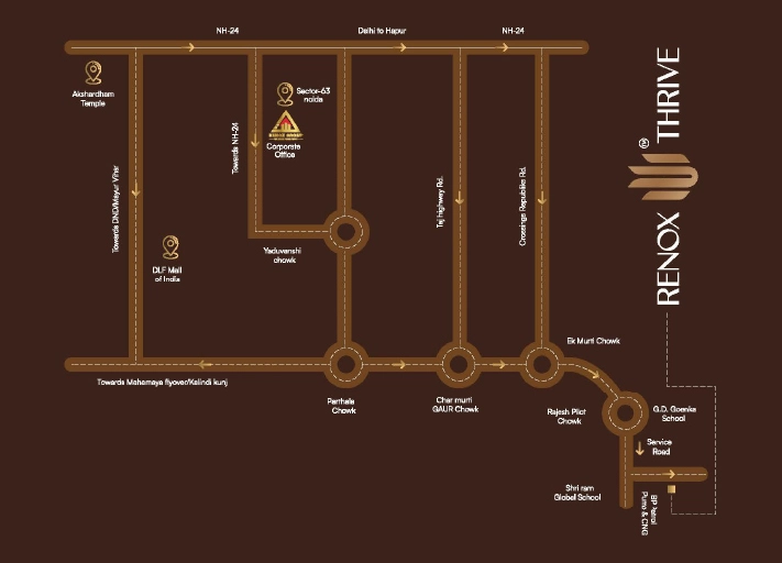Renox Thrive enjoys strategic connectivity to Noida, Delhi NCR, and the Delhi-Meerut Expressway and metro corridors, with the nearest railway station being Maripat Railway Station, placing key destinations, schools, hospitals, and shopping centers within easy reach. Each apartment is designed to maximize natural light and ventilation and comes with modular kitchens, branded fittings, premium interiors, and panoramic views for enhanced daily comfort.